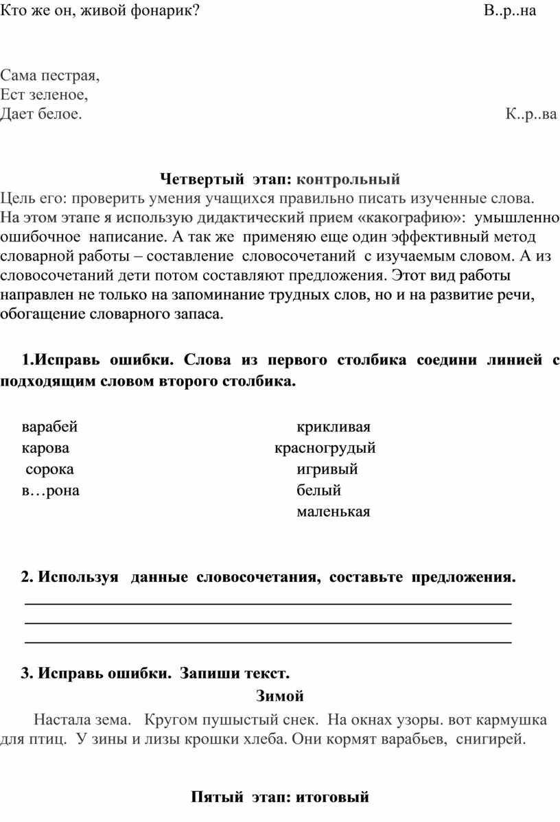 На этом этапе я использую дидактический прием «какографию»: умышленно ошибочное написание. А так же применяю еще один эффективный метод словарной работы – составление словосочетаний с изучаемым словом. А из словосочетаний дети потом составляют предложения. Этот вид работы направлен не только на запоминание трудных слов, но и на развитие речи, обогащение словарного запаса.