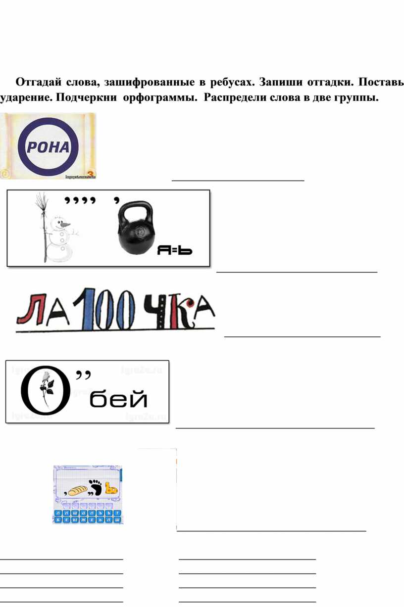 Отгадай слова, зашифрованные в ребусах. Запиши отгадки. Поставь ударение. Подчеркни орфограммы. Распредели слова в две группы.