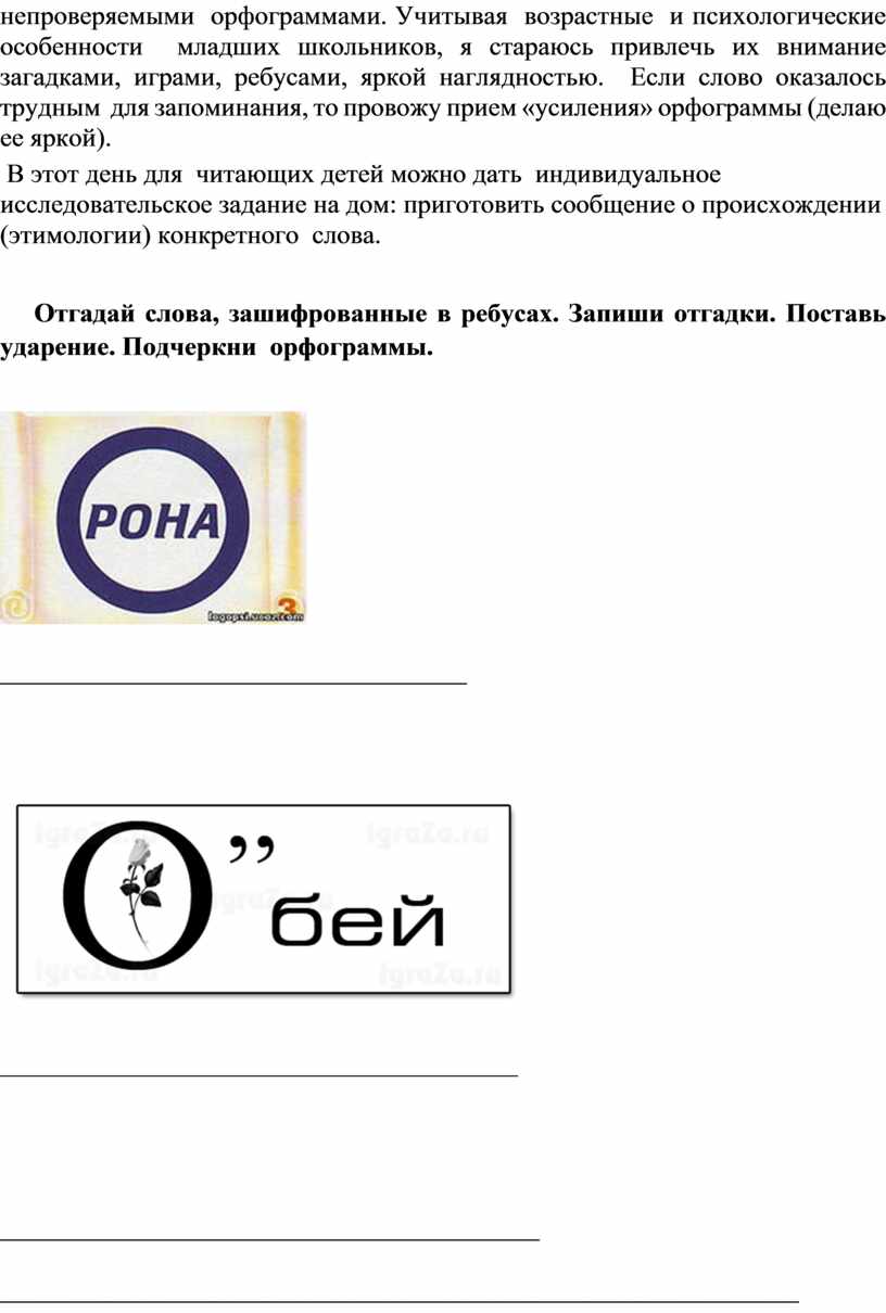 В первый день недели учащиеся знакомятся с группой слов. Знания не даются в готовом виде, поэтому для предъявления слов можно использовать ребусы (дети любят отгадывать ребусы). При разгадывании ребусов дети самостоятельно производят буквенный анализ, а затем и синтез слова, что способствует более прочному запоминанию написания слов с непроверяемыми орфограммами. Учитывая возрастные и психологические особенности младших школьников, я стараюсь привлечь их внимание загадками, играми, ребусами, яркой наглядностью. Если слово оказалось трудным для запоминания, то провожу прием «усиления» орфограммы (делаю ее яркой).
