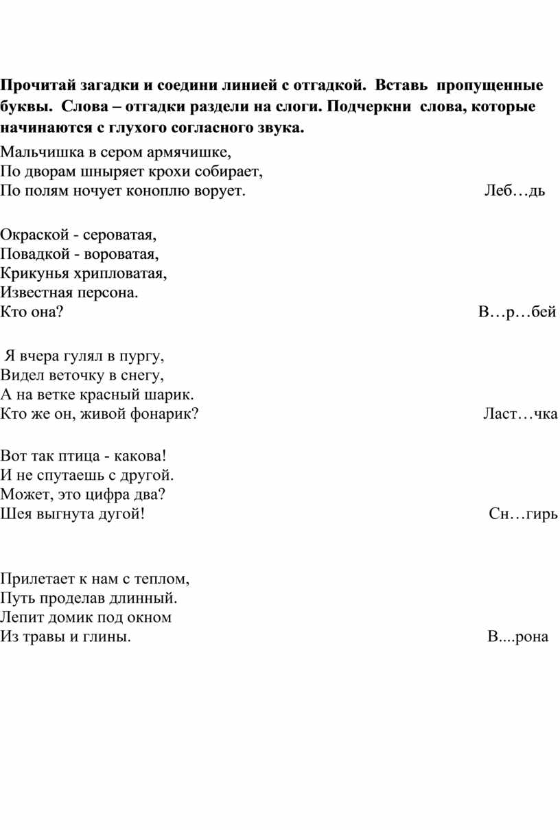 Прочитай загадки и соедини линией с отгадкой. Вставь пропущенные буквы. Слова – отгадки раздели на слоги. Подчеркни слова, которые начинаются с глухого согласного звука.