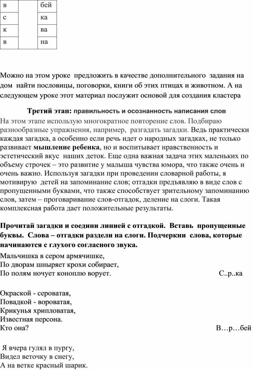 На этом этапе использую многократное повторение слов. Подбираю разнообразные упражнения, например, разгадать загадки. Ведь практически каждая загадка, а особенно если речь идет о народных загадках, не только развивает мышление ребенка, но и воспитывает нравственность и эстетический вкус наших деток. Еще одна важная задача этих маленьких по объему строчек – это развитие у малыша чувства юмора, что также очень и очень важно. Используя загадки при проведении словарной работы, я мотивирую детей на запоминание слов; отгадки предъявляю в виде слов с пропущенными буквами, что также способствует зрительному запоминанию слов, затем – проговаривание слов-отгадок, деление на слоги. Такая комплексная работа дает положительные результаты.