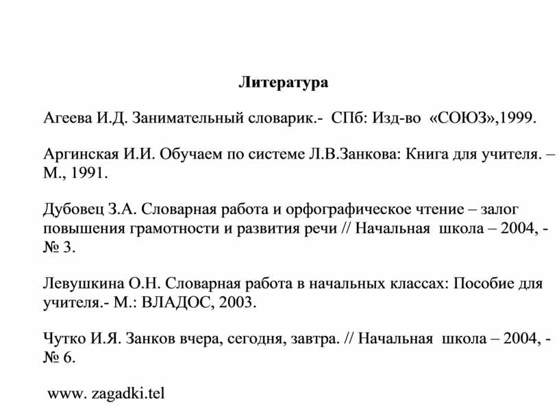 Левушкина О.Н. Словарная работа в начальных классах: Пособие для учителя.- М.: ВЛАДОС, 2003.