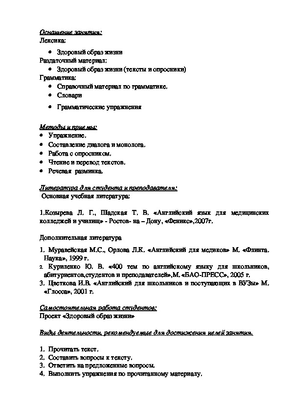 различные этапы занятия, что способствует усвоению учебного материала.МЕТОДИЧЕСКИЙ БЛОК.Тема: Чтение текстов по теме «Здоровый образ жизни»