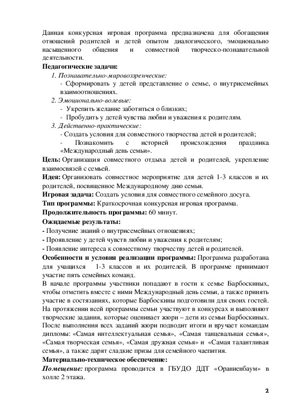 Игровая конкурсная программа разработана для учащихся 1-3 классов и их родителей. Данная программа может быть использована педагогами дополнительного образования, педагогами-организаторами образовательных учреждений для организации учебно-воспитательного процесса.Актуальность программы заключается в ориентации учащегося на общечеловеческие ценности.В программу заложено решение таких важных вопросов, как организация содержательного досуга подрастающего поколения, их социальная адаптация в условиях современной жизни посредством игровых методик