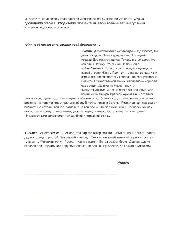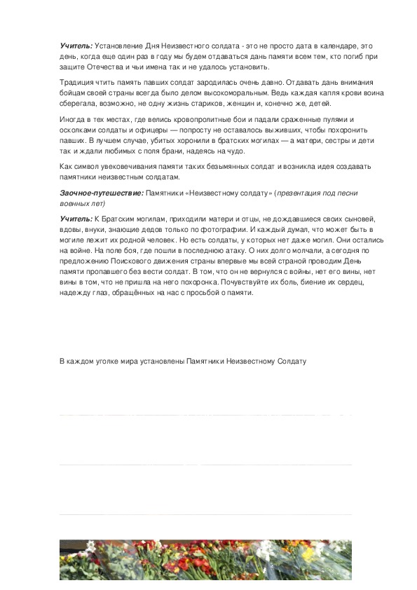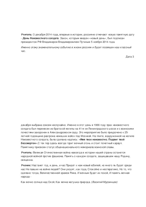 Как вечно солнце над Окой, Как вечна матушкаприрода. (Василий Мурзинцев)Учитель: Установление Дня Неизвестного солдата это не просто дата в календаре, это