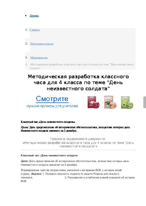 Цели: Дать представление об исторических обстоятельствах, вследствие которых день Неизвестного солдата назначен на 3 декабря.Классный час «День неизвестного солдата»