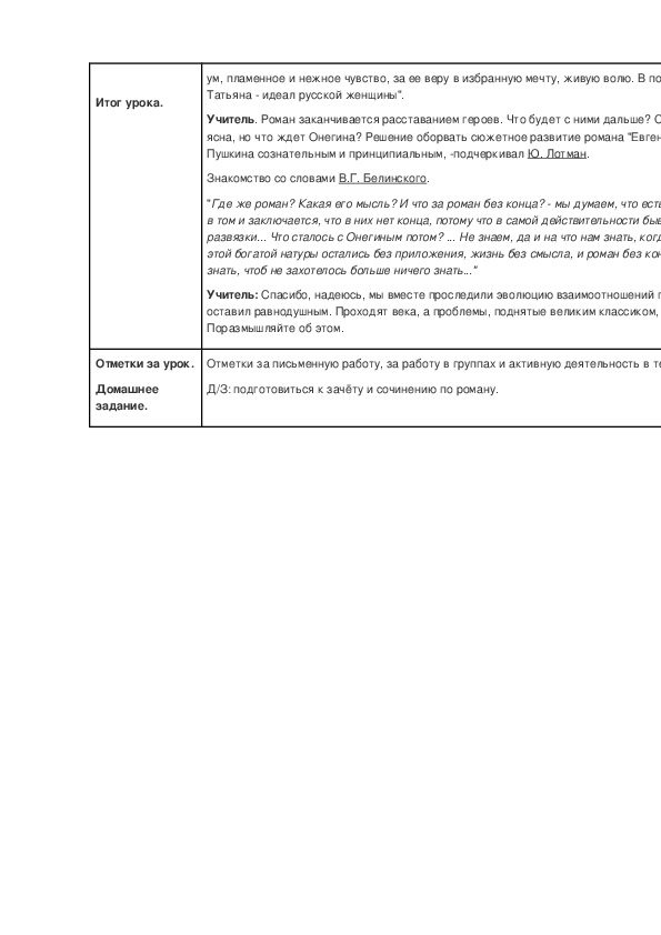 о Татьяне: "Пушкин любит свою героиню за цельность, благородство, простоту характера, заИтог урока.