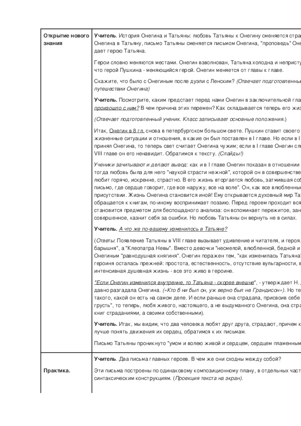 Учитель: Итак, мы сегодня на уроке проследим эволюцию взаимоотношений Татьяны и Онегина. А как вы