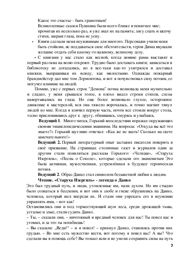 Мероприятие, посвященное М.Горькому.Жизнь Максима Горького была необычайно яркой и представляется поистине легендарной. Выходец из народных глубин, писатель уже при жизни воспринимался как крупнейший деятель русской культуры, как достойный приемник традиций великой русской литературы.«Человек – это звучит гордо…»