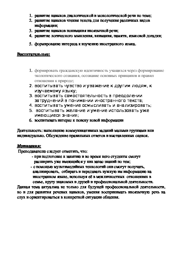 Тема данного занятия помогает студентам получить дополнительную информацию, систематизировать знания лексики и речевых оборотов, грамматических правил, сформировать гражданскую идентичность учащихся через формирование экологического сознания, осознание основных принципов и правил отношения к природе.