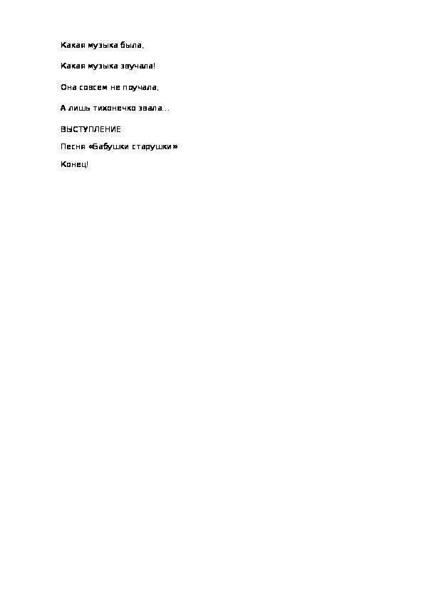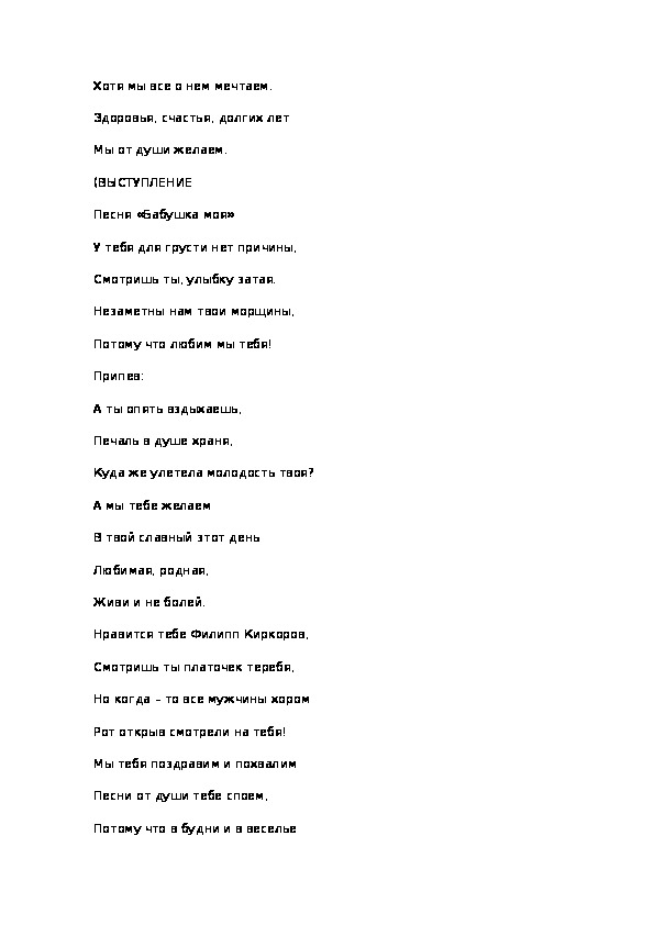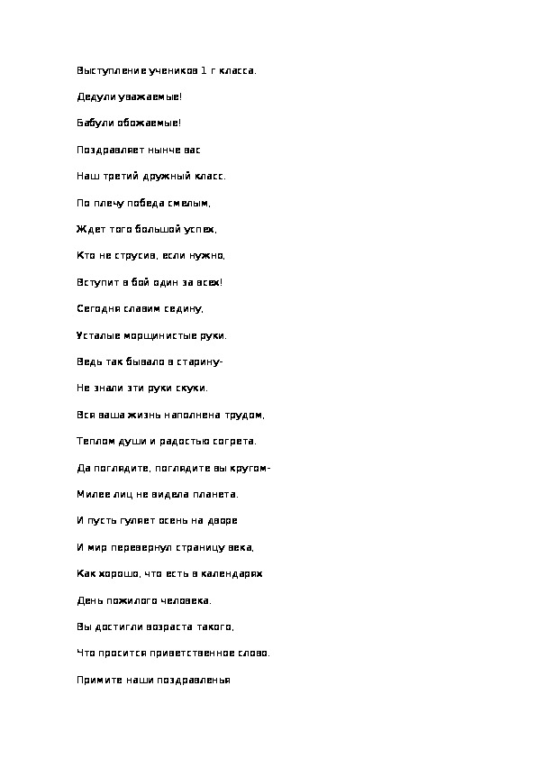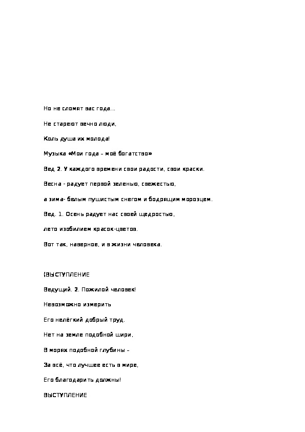 Методическая разработка будет полезна учителям начальных классов для проведения внеклассных мероприятий посвященных международному дню "Пожилого человека",так же может быть использован воспитателями и музыкальными работниками дошкольных образовательных учреждений. Материал построен в виде сценария .Адаптирован для младшего школьного возраста.В публикации представлены стихи,песни.