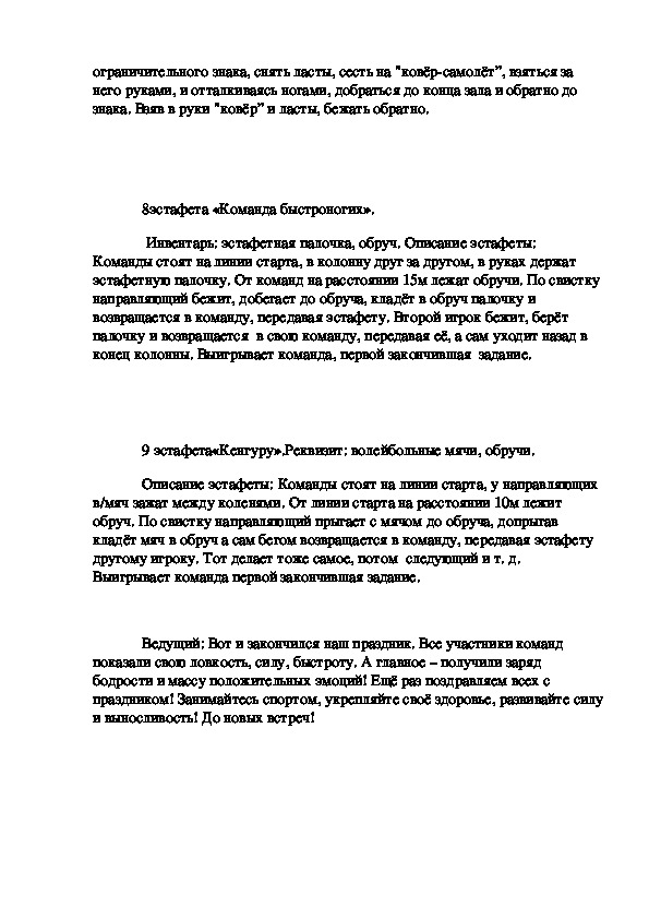 лягушки и покататься на "ковёресамолёте”. В ластах добежать доограничительного знака, снять ласты, сесть на "ковёрсамолёт”, взяться за