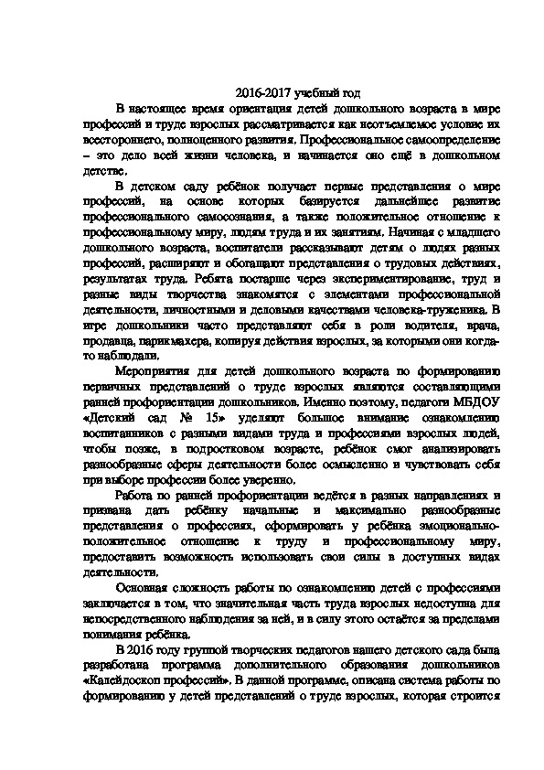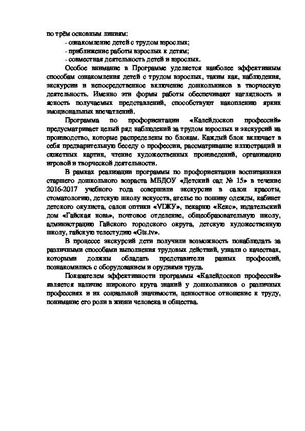 «Калейдоскоп профессий». В данной программе, описана система работы по