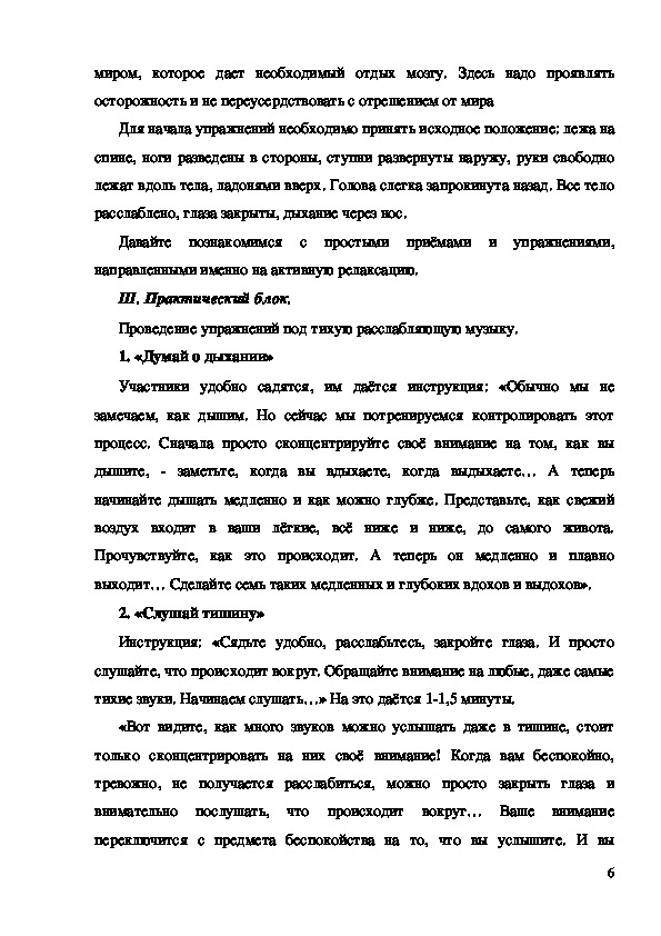 II. Основная часть. Лекция, упражнения на релаксацию, беседы, что будет