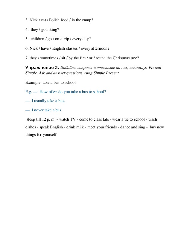 Упражнение 2. Задайте вопросы и ответьте на них, используя Present