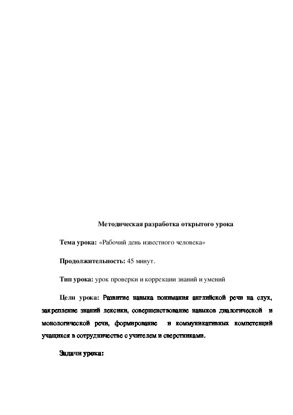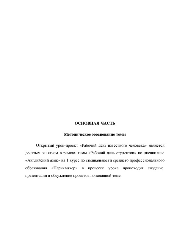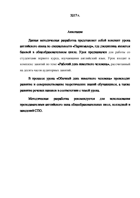 Методическая разработана как конспект урока английского языка по специальности «Парикмахер». Урок проводится со студентами первого курса, изучающими английский язык и входит в комплекс занятий по теме «Рабочий день известного человека» (10 часов аудиторных занятий). Урока «Обычный день известного человека» направлен на развитие и совершенствование теоретических знаний обучающихся, а также развитие речевых навыков в соответствии с темой урока.