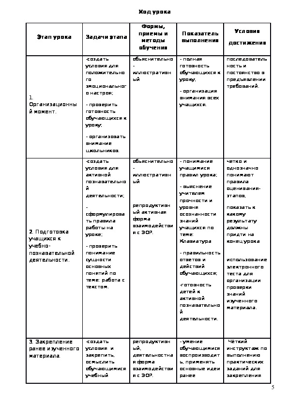Структура урока соответствует выбранному типу и состоит из 5 этапов.
