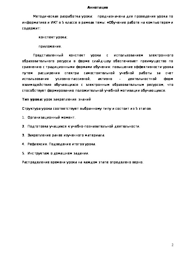Методическая разработка урока: предназначена для проведения урока по информатике и ИКТ в 5 классе в рамках темы: «Обучение работе на компьютере» и содержит: