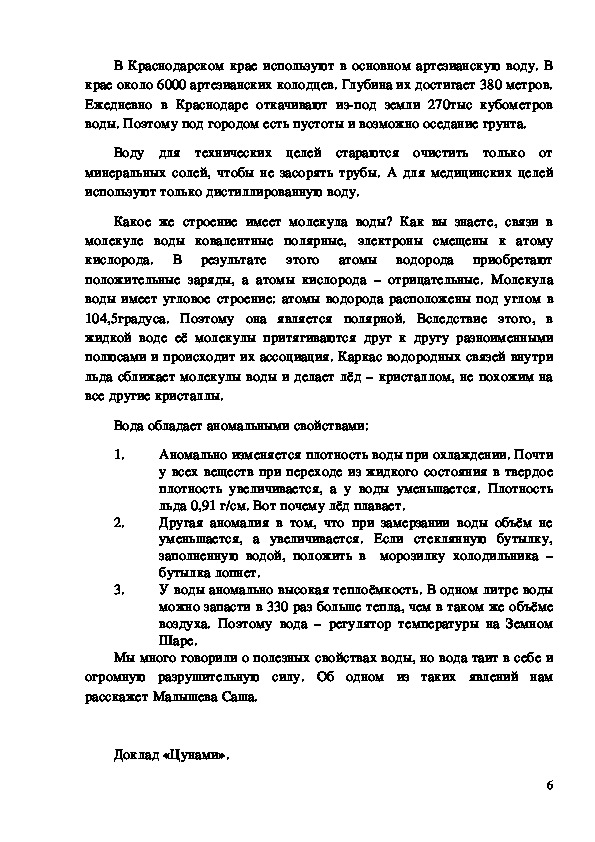 3. Показать взаимосвязь химии с биологией (вода в организме человека и животных), с физикой (физические и аномальные свойства воды), с географией (природные явления), а также с экологией Краснодарского края.