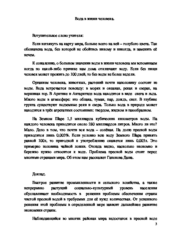 Методическая разработка "Значение воды в жизни человека" 9 класс.Цель урока: