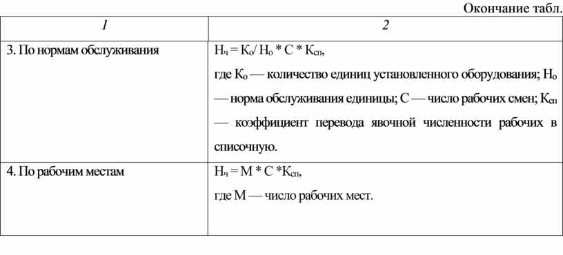 Нч = Ко/ Но * С * Ксп, где Ко — количество единиц установленного оборудования; Но — норма обслуживания единицы; С — число рабочих смен; Ксп — коэффициент перевода явочной численности рабочих в списочную. |