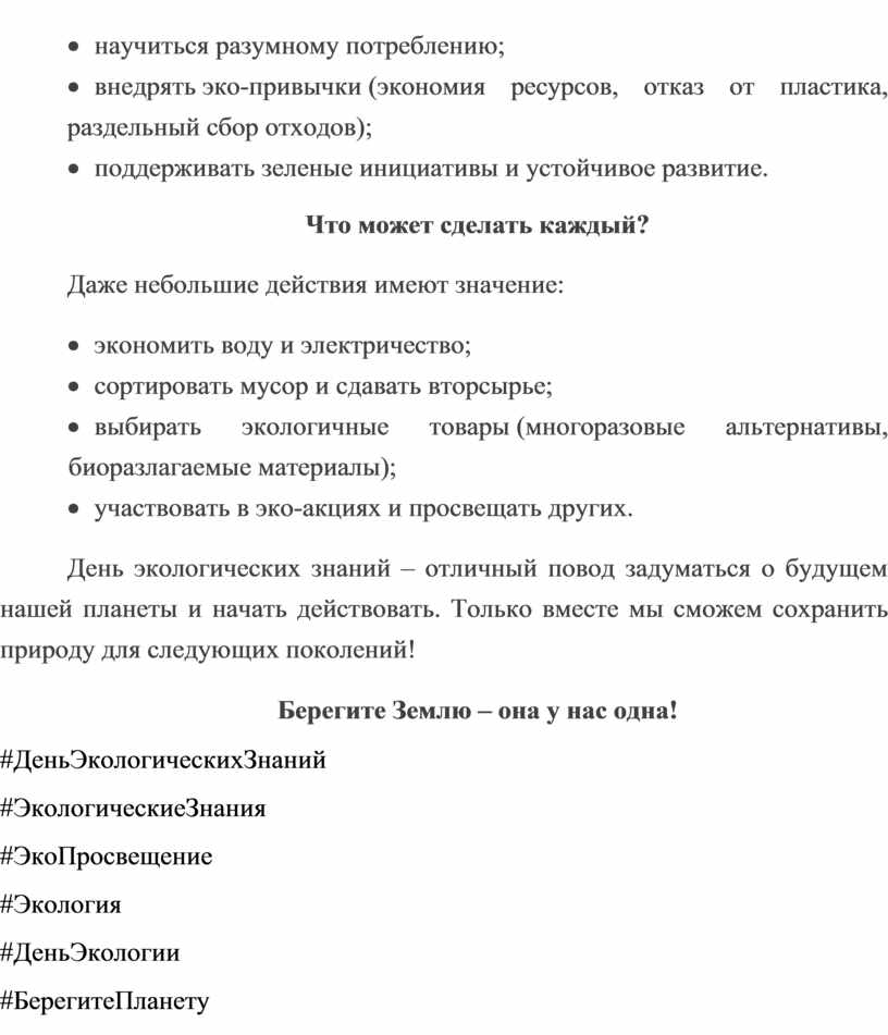 · внедрять эко-привычки (экономия ресурсов, отказ от пластика, раздельный сбор отходов);