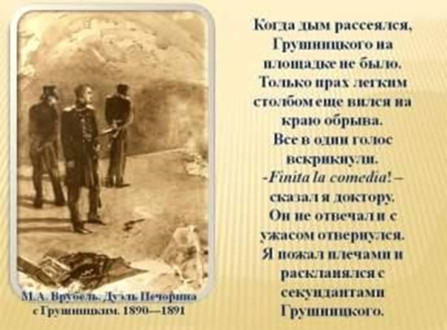 Дуэль Грушницкого и Печорина раскрывает истинную сущность первого, который отвергает примирение, а