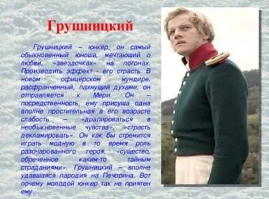 Грушницкий из простой семьи. Обычный юнкер, он весьма амбициозен, и всеми правдами и неправдами стремится выбиться в люди.