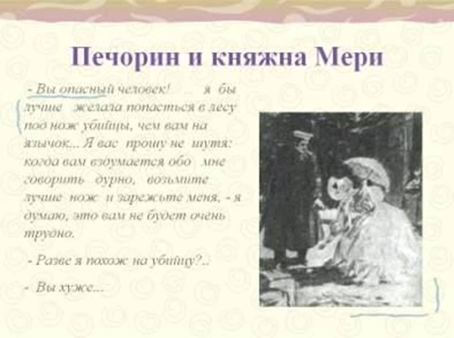 Печорина раскрывается в повести «Княжна Мери», где происходит его встреча с Грушницким.
