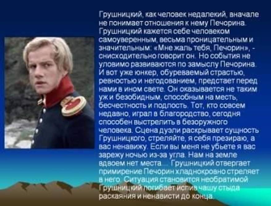 Грушницкий стремится играть роль разочарованного героя, модную в то время, изображая из себя существо,