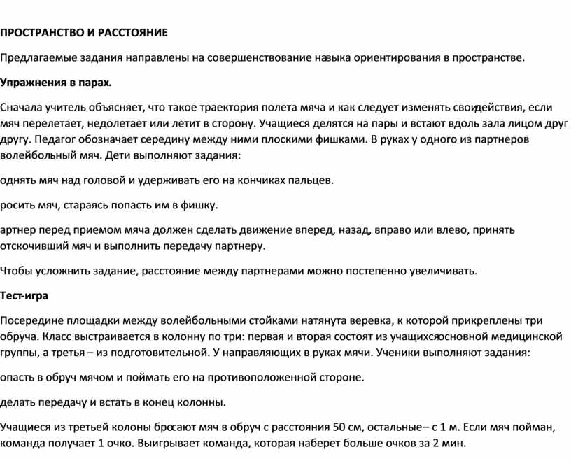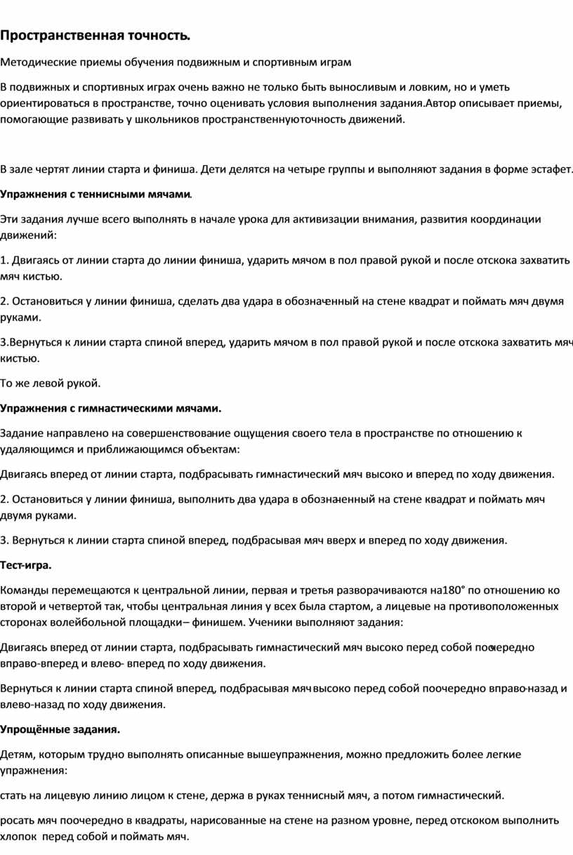 В подвижных и спортивных играх очень важно не только быть выносливым и ловким, но и уметь ориентироваться в пространстве, точно оценивать условия выполнения задания. Автор описывает приемы, помогающие развивать у школьников пространственную точность движений.