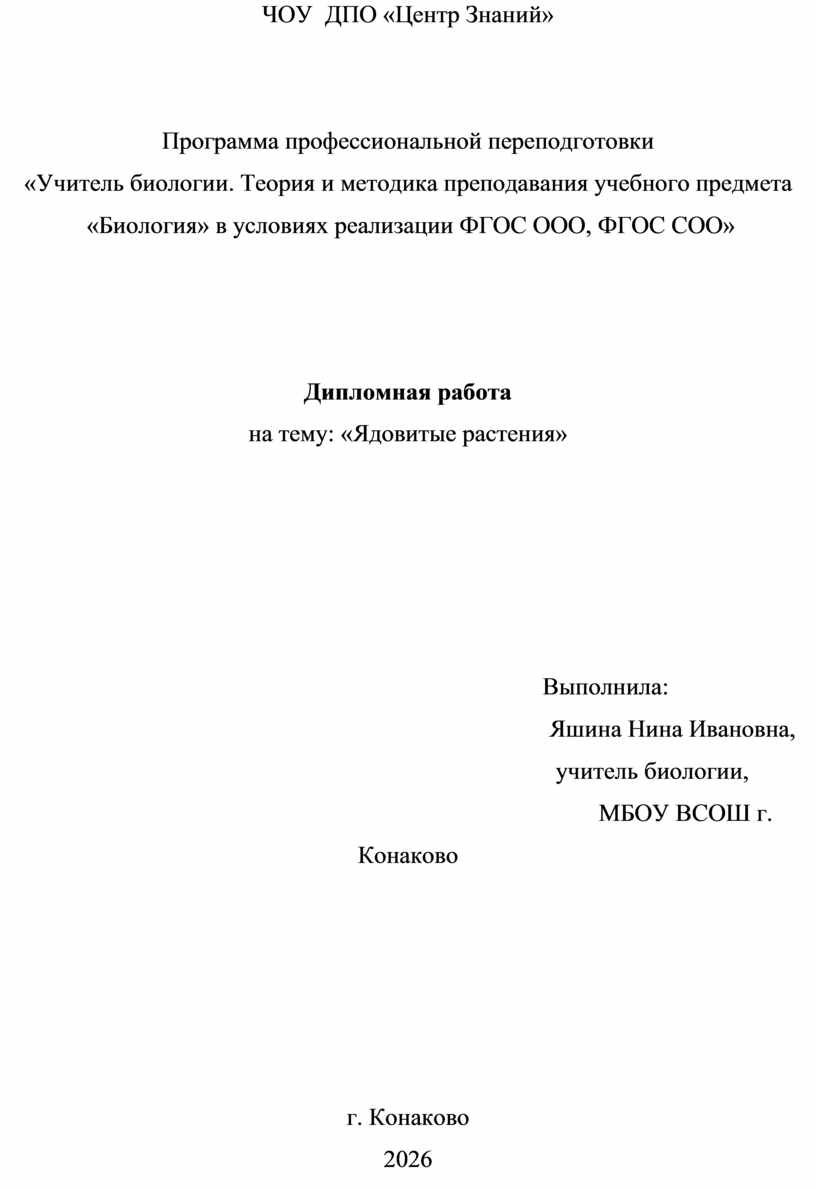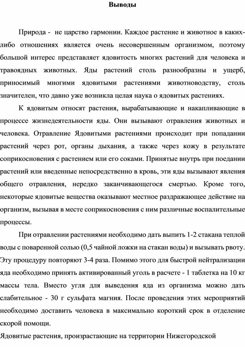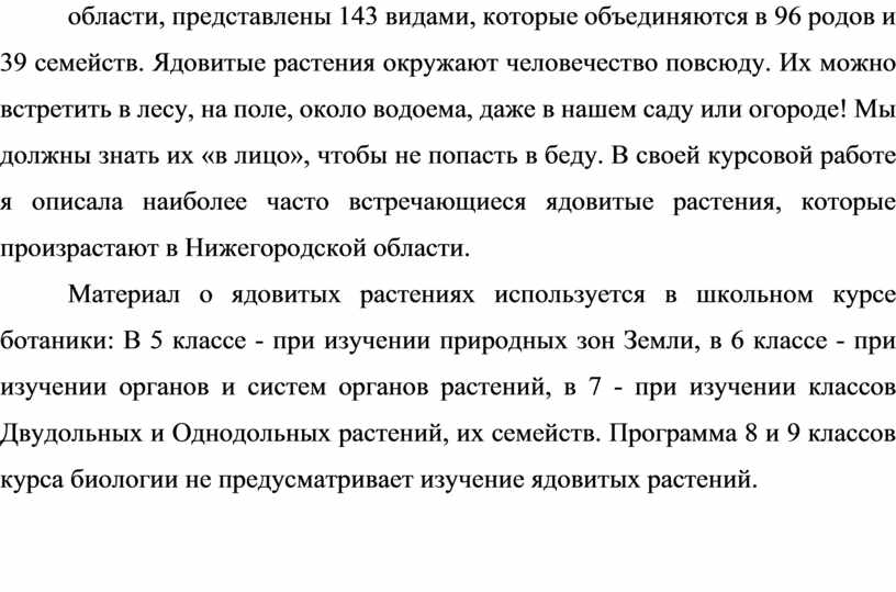 Ядовитые растения, произрастающие на территории Нижегородской области, представлены 143 видами, которые объединяются в 96 родов и 39 семейств. Ядовитые растения окружают человечество повсюду. Их можно встретить в лесу, на поле, около водоема, даже в нашем саду или огороде! Мы должны знать их «в лицо», чтобы не попасть в беду. В своей курсовой работе я описала наиболее часто встречающиеся ядовитые растения, которые произрастают в Нижегородской области.