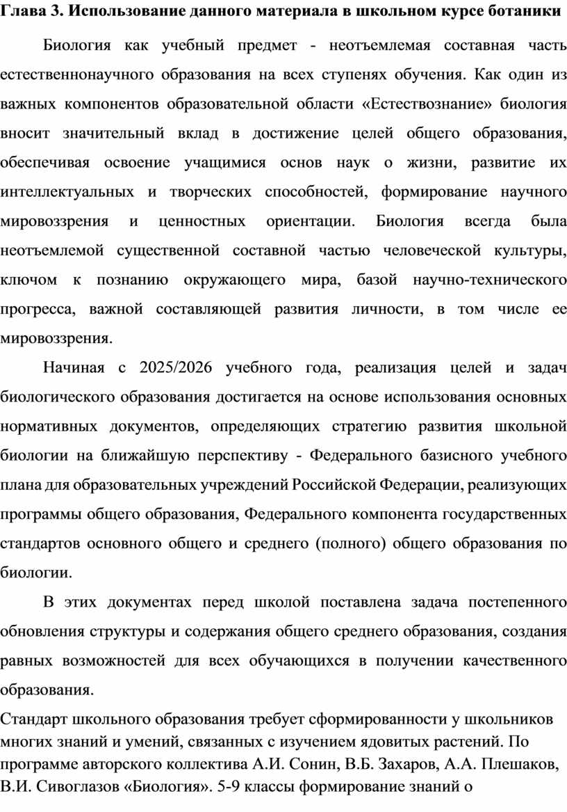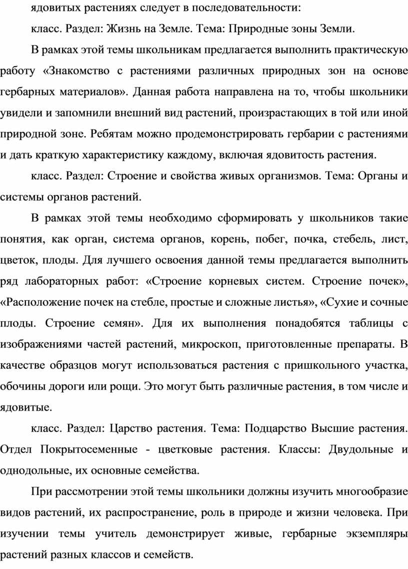 Стандарт школьного образования требует сформированности у школьников многих знаний и умений, связанных с изучением ядовитых растений. По программе авторского коллектива А.И. Сонин, В.Б. Захаров, А.А. Плешаков, В.И. Сивоглазов «Биология». 5-9 классы формирование знаний о ядовитых растениях следует в последовательности: