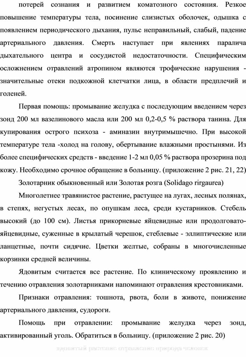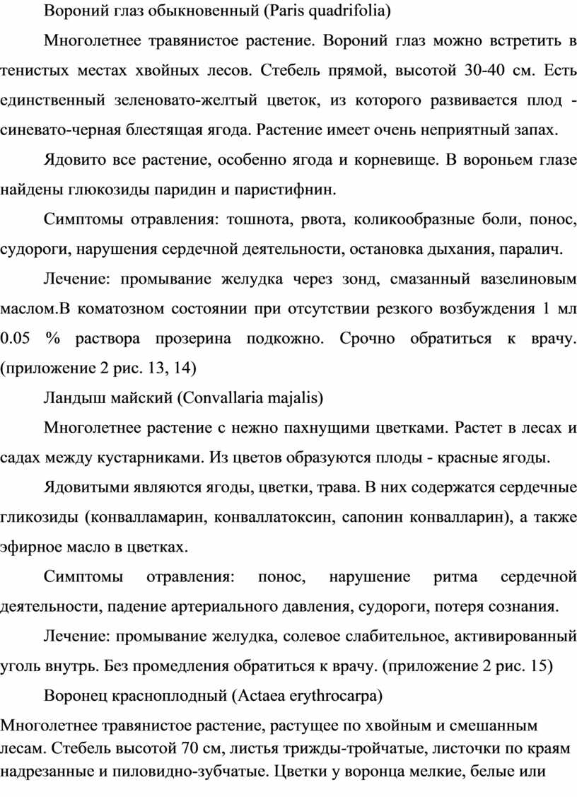 Лечение: промывание желудка, солевое слабительное, активированный уголь внутрь. Без промедления обратиться к врачу. (приложение 2 рис. 15)
