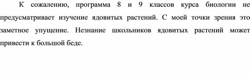 К сожалению, программа 8 и 9 классов курса биологии не предусматривает изучение ядовитых растений. С моей точки зрения это заметное упущение. Незнание школьников ядовитых растений может привести к большой беде.