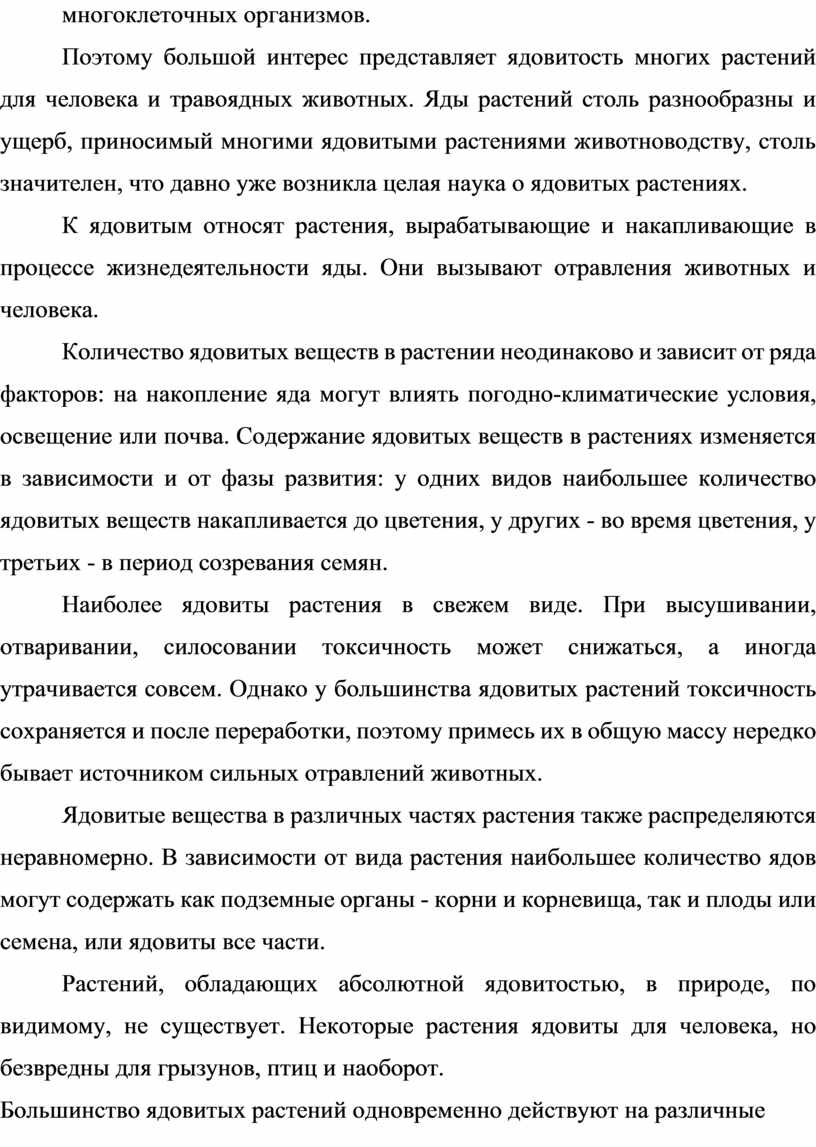 Поэтому большой интерес представляет ядовитость многих растений для человека и травоядных животных. Яды растений столь разнообразны и ущерб, приносимый многими ядовитыми растениями животноводству, столь значителен, что давно уже возникла целая наука о ядовитых растениях.