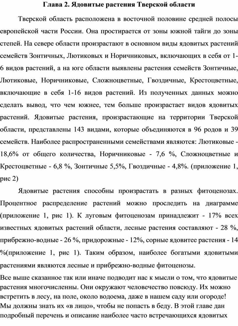 Тверской область расположена в восточной половине средней полосы европейской части России. Она простирается от зоны южной тайги до зоны степей. На севере области произрастают в основном виды ядовитых растений семейств Зонтичных, Лютиковых и Норичниковых, включающих в себя от 1-6 видов растений, а на юге области выявлены растения семейств Зонтичные, Лютиковые, Норичниковые, Сложноцветные, Гвоздичные, Крестоцветные, включающие в себя 1-16 видов растений. Из полученных данных можно сделать вывод, что чем южнее, тем больше произрастает видов ядовитых растений. Ядовитые растения, произрастающие на территории Тверской области, представлены 143 видами, которые объединяются в 96 родов и 39 семейств. Наиболее распространенными семействами являются: Лютиковые - 18,6% от общего количества, Норичниковые - 7,6 %, Сложноцветные и Крестоцветные - 6,8 %, Зонтичные 5,5%, Гвоздичные - 4,8%. (приложение 1, рис 2)