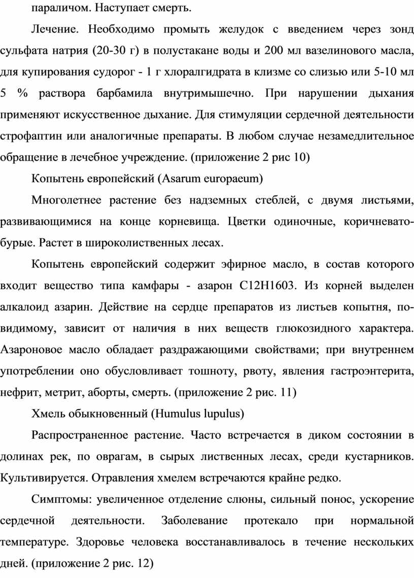 Лечение. Необходимо промыть желудок с введением через зонд сульфата натрия (20-30 г) в полустакане воды и 200 мл вазелинового масла, для купирования судорог - 1 г хлоралгидрата в клизме со слизью или 5-10 мл 5 % раствора барбамила внутримышечно. При нарушении дыхания применяют искусственное дыхание. Для стимуляции сердечной деятельности строфаптин или аналогичные препараты. В любом случае незамедлительное обращение в лечебное учреждение. (приложение 2 рис 10)