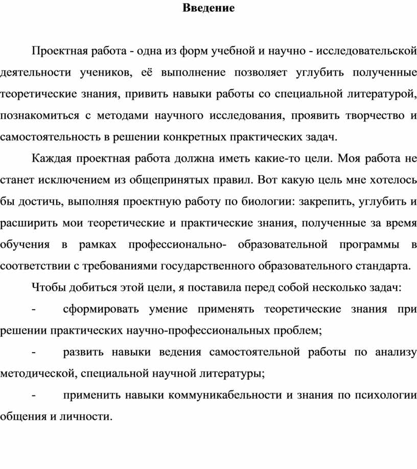 Каждая проектная работа должна иметь какие-то цели. Моя работа не станет исключением из общепринятых правил. Вот какую цель мне хотелось бы достичь, выполняя проектную работу по биологии: закрепить, углубить и расширить мои теоретические и практические знания, полученные за время обучения в рамках профессионально- образовательной программы в соответствии с требованиями государственного образовательного стандарта.