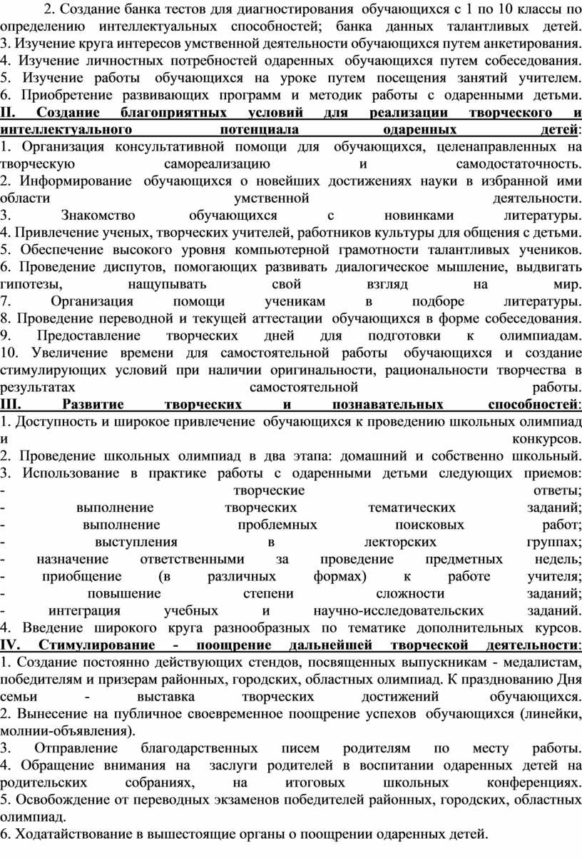 1) создание системы целенаправленного выявления и отбора одарённых детей в разных областях науки и творчества;