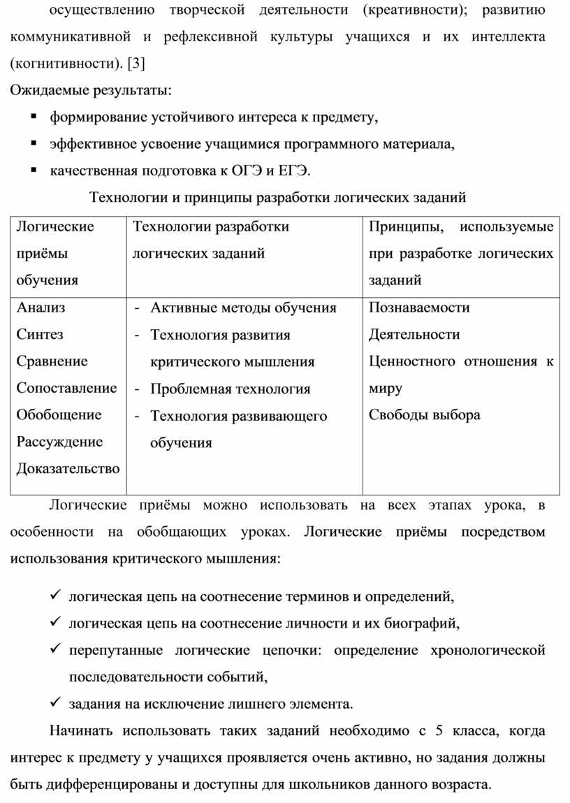 Одной из главных задач российской образовательной политики является обеспечение современного качества образования, развития и становления личности, способной жить в изменяющемся информационном мире. Важнейшим условием решения этой задачи является применение учителями в своей педагогической практике современных образовательных технологий. [1]. Главная задача учителя не только дать учащимся определённую сумму знаний, но и развить их интерес к учению. Ведь интерес, как известно, важный инструмент, побуждающий учеников к более глубокому познанию предмета, развитию их мыслительных способностей. Логические приёмы являются одним из средств достижения более качественного усвоения учащимися изучаемого материала. [6]