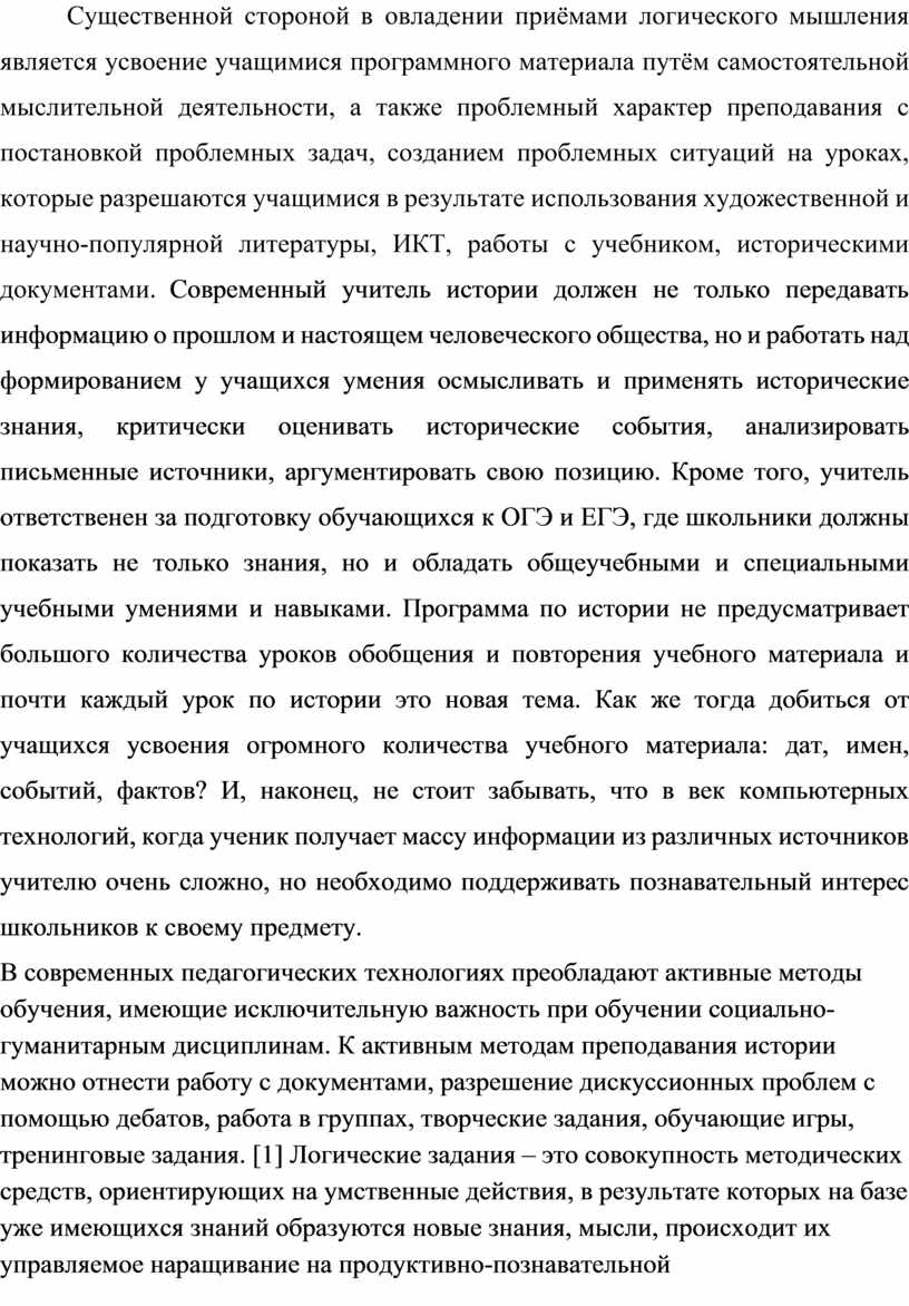 Существенной стороной в овладении приёмами логического мышления является усвоение учащимися программного материала путём самостоятельной мыслительной деятельности, а также проблемный характер преподавания с постановкой проблемных задач, созданием проблемных ситуаций на уроках, которые разрешаются учащимися в результате использования художественной и научно-популярной литературы, ИКТ, работы с учебником, историческими документами. Современный учитель истории должен не только передавать информацию о прошлом и настоящем человеческого общества, но и работать над формированием у учащихся умения осмысливать и применять исторические знания, критически оценивать исторические события, анализировать письменные источники, аргументировать свою позицию. Кроме того, учитель ответственен за подготовку обучающихся к ОГЭ и ЕГЭ, где школьники должны показать не только знания, но и обладать общеучебными и специальными учебными умениями и навыками. Программа по истории не предусматривает большого количества уроков обобщения и повторения учебного материала и почти каждый урок по истории это новая тема. Как же тогда добиться от учащихся усвоения огромного количества учебного материала: дат, имен, событий, фактов? И, наконец, не стоит забывать, что в век компьютерных технологий, когда ученик получает массу информации из различных источников учителю очень сложно, но необходимо поддерживать познавательный интерес школьников к своему предмету.