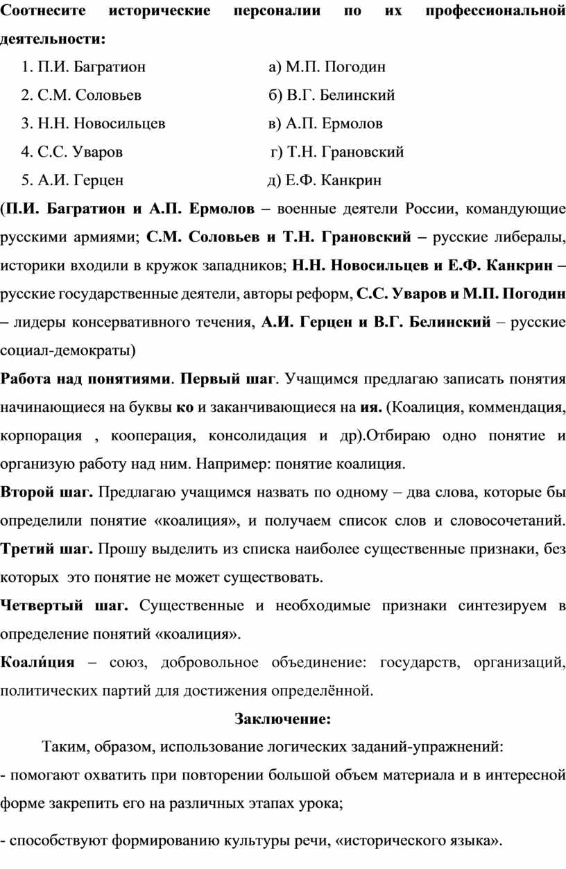 (П.И. Багратион и А.П. Ермолов – военные деятели России, командующие русскими армиями; С.М. Соловьев и Т.Н. Грановский – русские либералы, историки входили в кружок западников; Н.Н. Новосильцев и Е.Ф. Канкрин – русские государственные деятели, авторы реформ, С.С. Уваров и М.П. Погодин – лидеры консервативного течения, А.И. Герцен и В.Г. Белинский – русские социал-демократы)