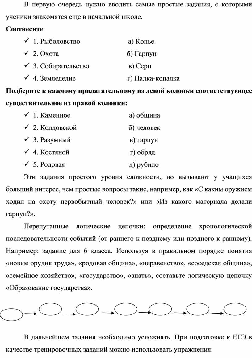 Перепутанные логические цепочки: определение хронологической последовательности событий (от раннего к позднему или позднего к раннему). Например: задание для 6 класса. Используя в правильном порядке понятия «новые орудия труда», «родовая община», «неравенство», «соседская община», «семейное хозяйство», «государство», «знать», составьте логическую цепочку «Образование государства».