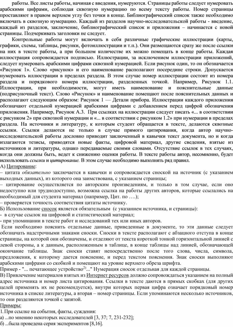 Контрольная работа, в соответствии с требованиями ФГОС СПО, является видом учебно-воспитательной работы по конкретной дисциплине и носит учебно-исследовательский характер. Тематика работ должна соответствовать предметной области, отличаться актуальностью. Контрольная работа может носить и прикладной характер, то есть представлять собой самостоятельное исследование по отдельной теме, практический анализ признанной проблемы применительно к конкретному учреждению (организации). Оценка работы осуществляется по трем направлениям: требования к структуре, требования к содержанию и требования к оформлению.