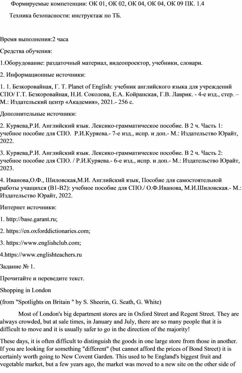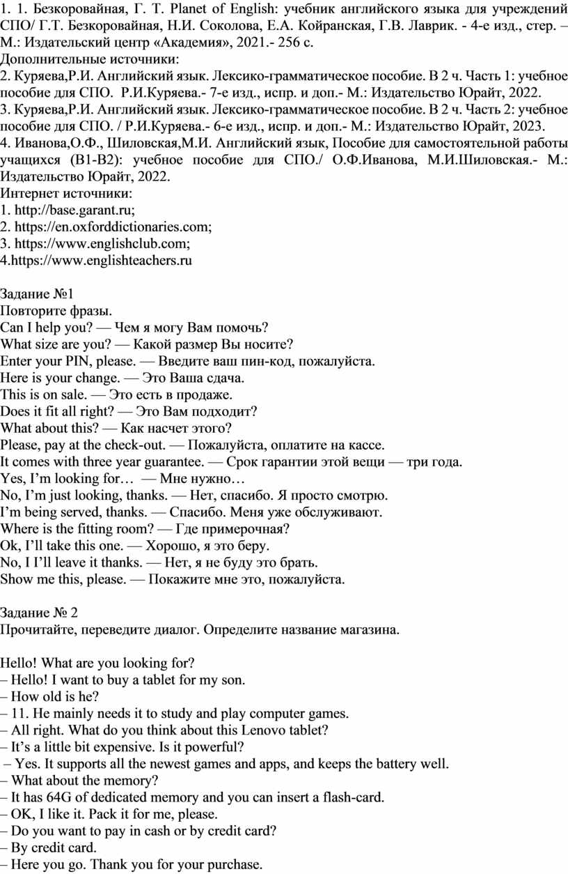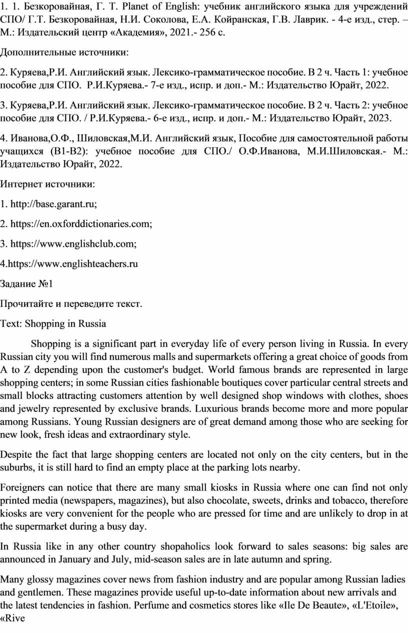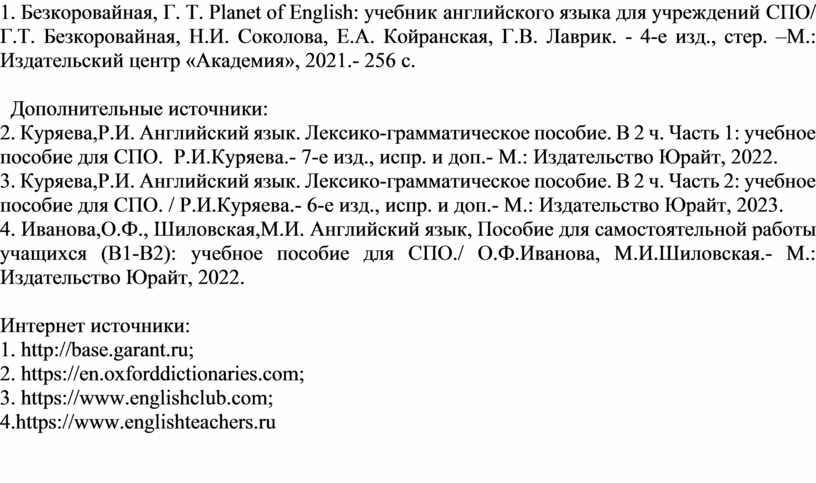 1. Безкоровайная, Г. Т. Planet of English: учебник английского языка для учреждений СПО/ Г.Т. Безкоровайная, Н.И. Соколова, Е.А. Койранская, Г.В. Лаврик. - 4-е изд., стер. –М.: Издательский центр «Академия», 2021.- 256 с.