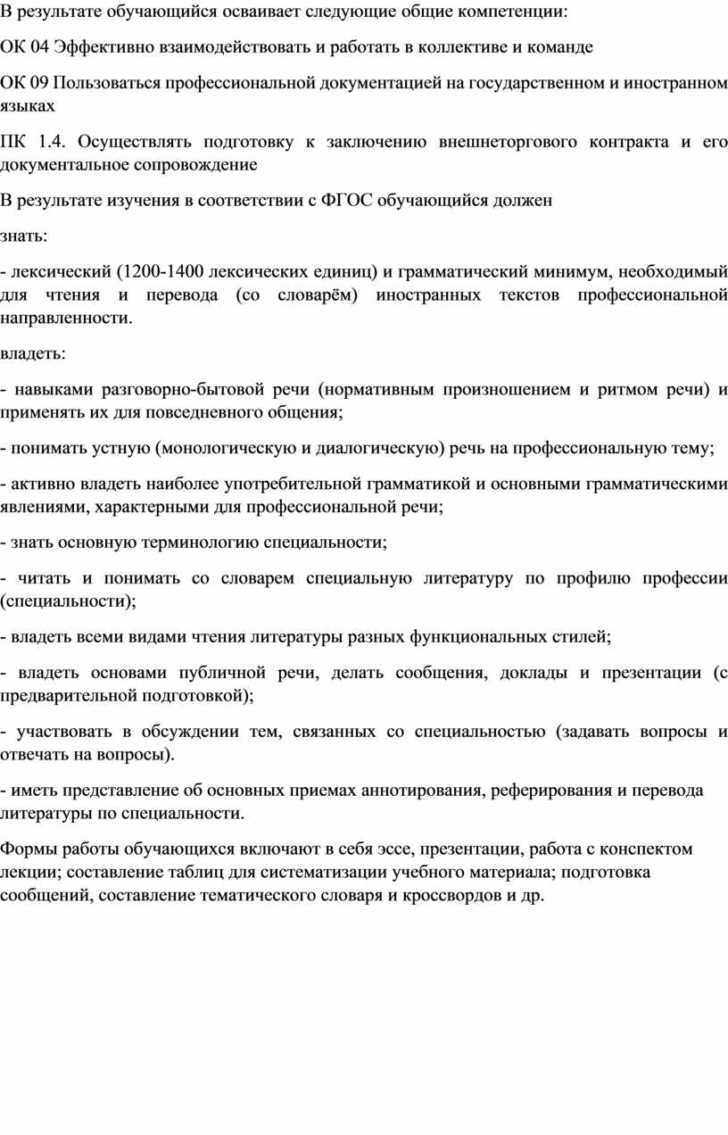 ПК 1.4. Осуществлять подготовку к заключению внешнеторгового контракта и его документальное сопровождение