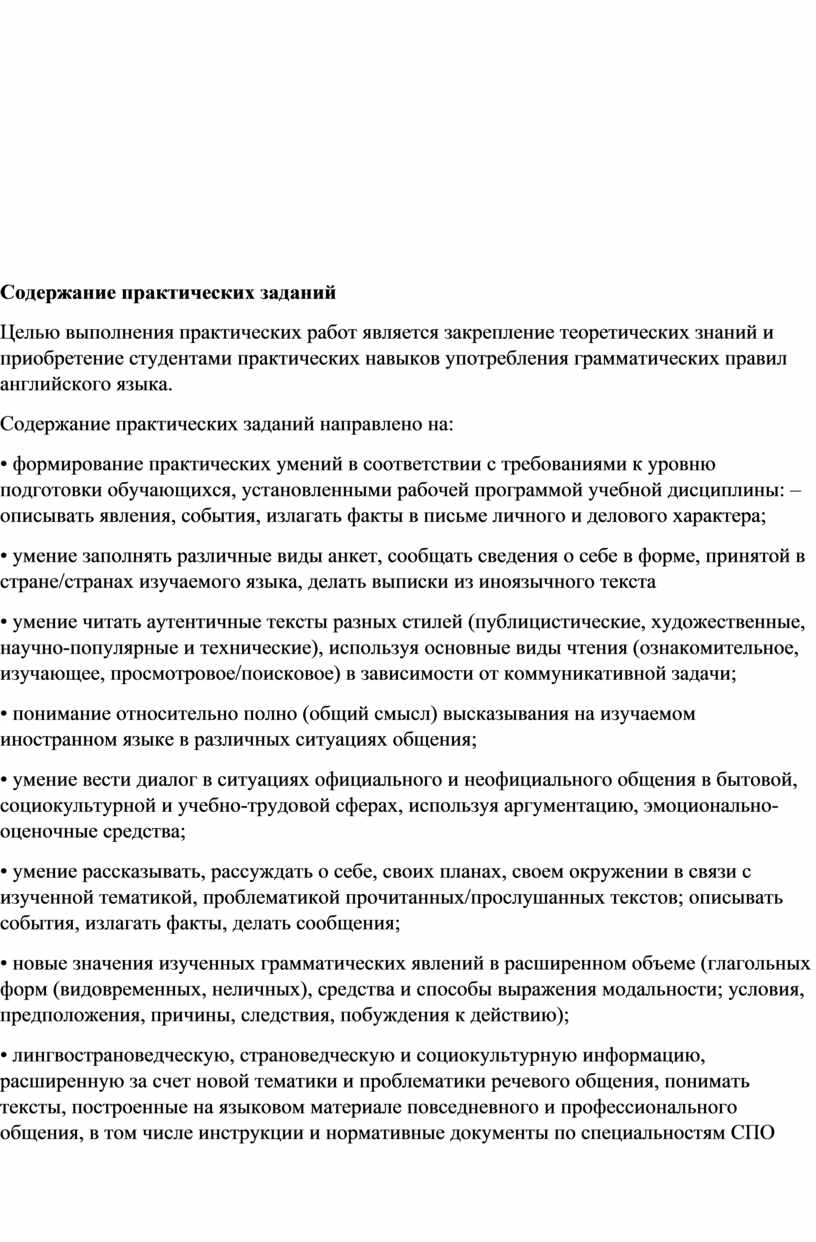 Целью выполнения практических работ является закрепление теоретических знаний и приобретение студентами практических навыков употребления грамматических правил английского языка.