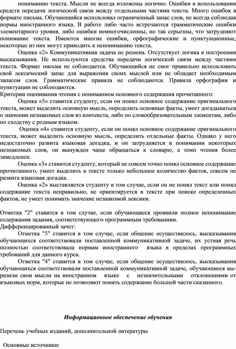 Оценка «2» выставляется студенту в том случае, если он не понял текст или понял содержание текста неправильно, не ориентируется в тексте при поиске определенных фактов, не умеет понимать значение незнакомой лексики.