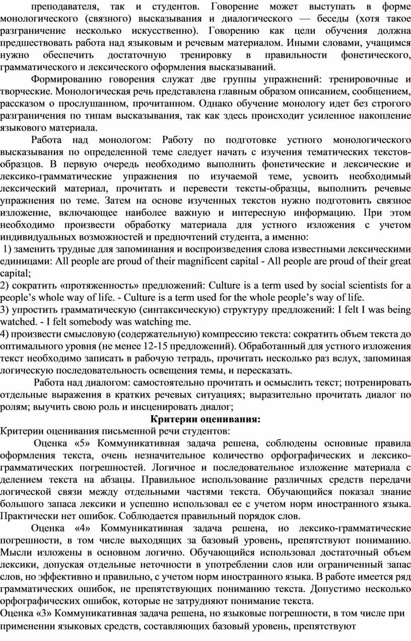 Работа над монологом: Работу по подготовке устного монологического высказывания по определенной теме следует начать с изучения тематических текстов-образцов. В первую очередь необходимо выполнить фонетические и лексические и лексико-грамматические упражнения по изучаемой теме, усвоить необходимый лексический материал, прочитать и перевести тексты-образцы, выполнить речевые упражнения по теме. Затем на основе изученных текстов нужно подготовить связное изложение, включающее наиболее важную и интересную информацию. При этом необходимо произвести обработку материала для устного изложения с учетом индивидуальных возможностей и предпочтений студента, а именно: